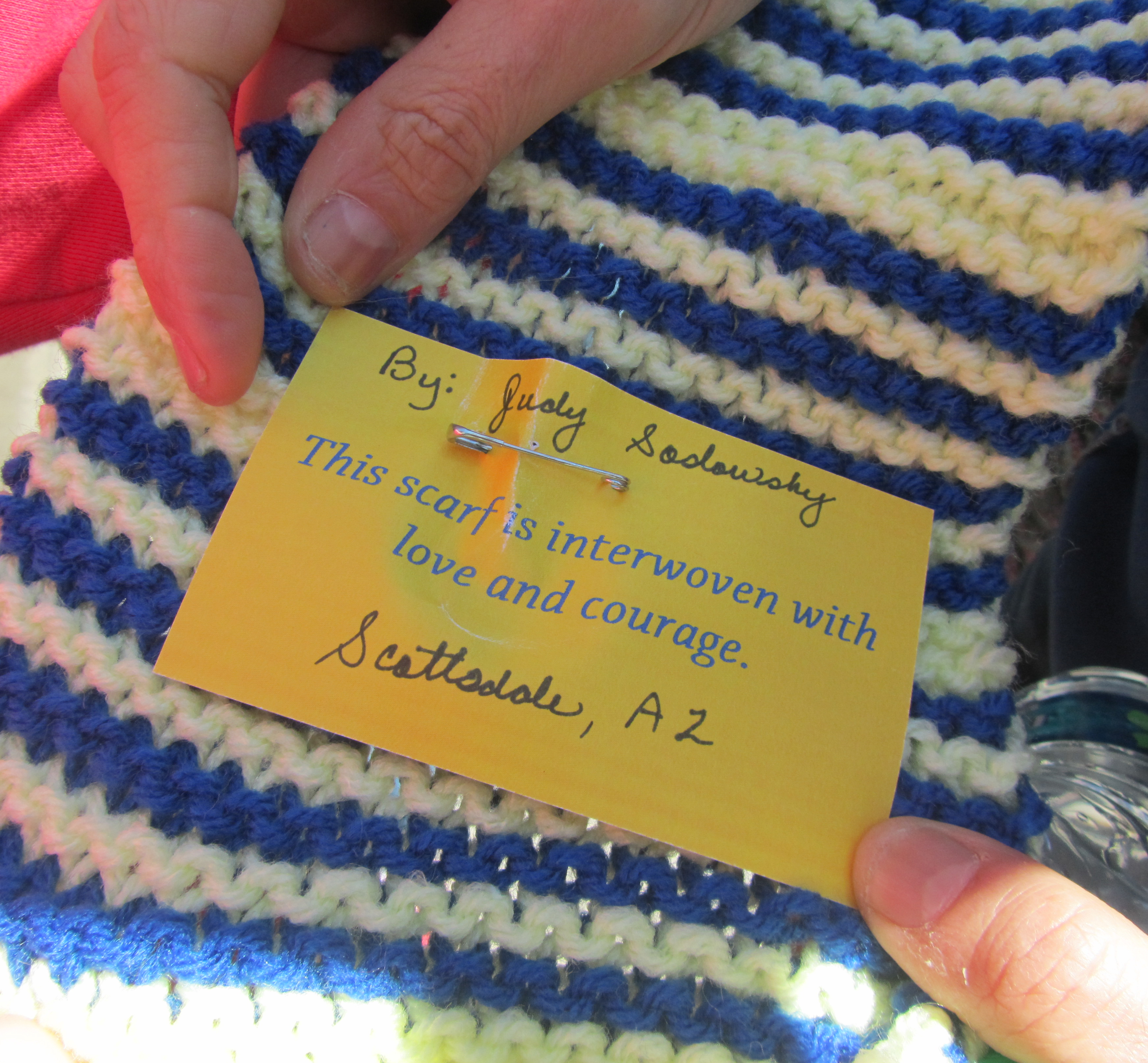 ¿De dónde salían todas esas bufandas azules y amarillas que en los días previos veíamos por la ciudad? Una preciosa iniciativa de la Old South Church de Boylston Street, junto a la línea de meta: bufandas tejidas con amor y coraje para dar fuerza a los corredores. Se entregaban al paso, a las puertas de la iglesia, con una miniceremonia que honraba al corredor. Algo así como: nos honras con tu presencia para correr nuestro maratón, te mereces toda nuestra fuerza y apoyo.