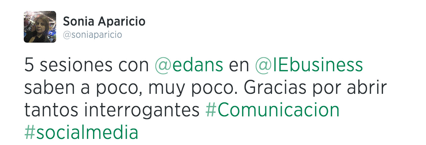 Espectaculares han sido también las sesiones de Planificación de Campañas Digitales de Javier Barrio, uno de los profesores más divertidos e irónicos que he tenido en mi vida, lo cual se agradece enormemente a la hora de hablar de SEO, SEM, CPM, CPL, CPC, tasa de rebote, behavioral targeting, marketing de contenidos… Tras 14 años trabajando en Internet, he aprendido tantas cosas nuevas, útiles y necesarias que, Javier, confieso que me has ganado para siempre como alumna-fan. (Eso es engagement, ¿no?). Y qué decir de Enrique Dans. Magistral.