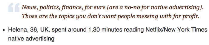 Además, muchos encuestados consideraron que algunas áreas de contenido (política nacional e internacional y las noticias financieras) deben ser consideradas “sagradas” y no mezclarse con publicidad nativa.