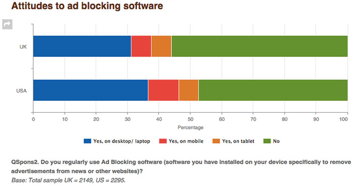 Esta molestia y la interrupción que la publicidad causa en la experiencia de lectura está fomentando el uso de bloqueadores de anuncios para minimizar su impacto (39% en UK, 47% en USA). La cifra es mayor en la franja de edad 18-24 (56%).