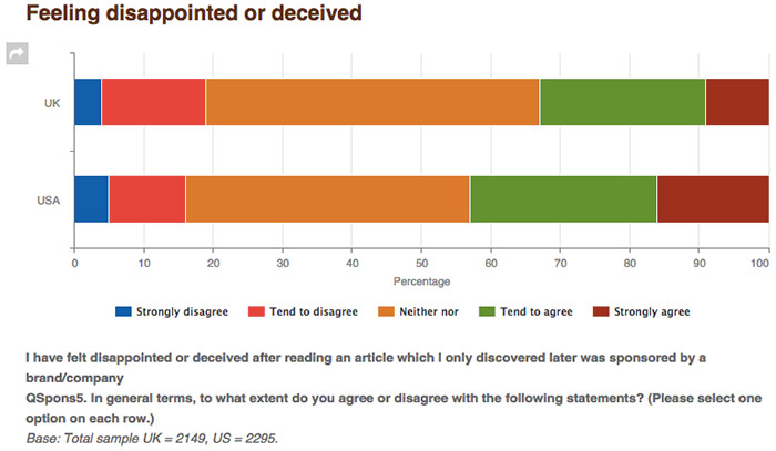 Los lectores se sienten decepcionados o engañados si “más adelante” (después de leer) descubren contenido fue patrocinado por una marca o empresa: 33 % en UK; 43 % en USA (La cifra más alta en USA podría deberse al hecho de que la publicidad nativa es más frecuente allí).