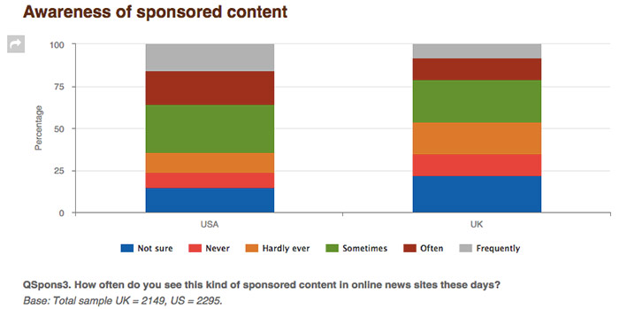 Los consumidores rechazan la publicidad molesta, pero aceptan que la publicidad es necesaria para tener acceso a información y noticias gratuitas. Es decir, la publicidad no molesta es bien recibida: En USA, el 35% dice que ve con frecuencia contenido esponsorizado; el 21% en UK.